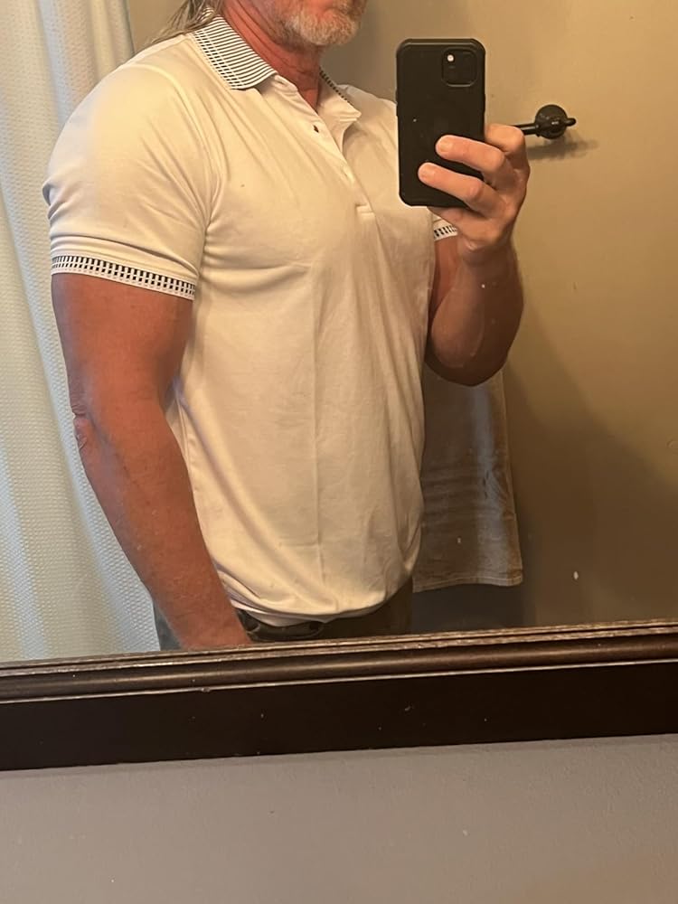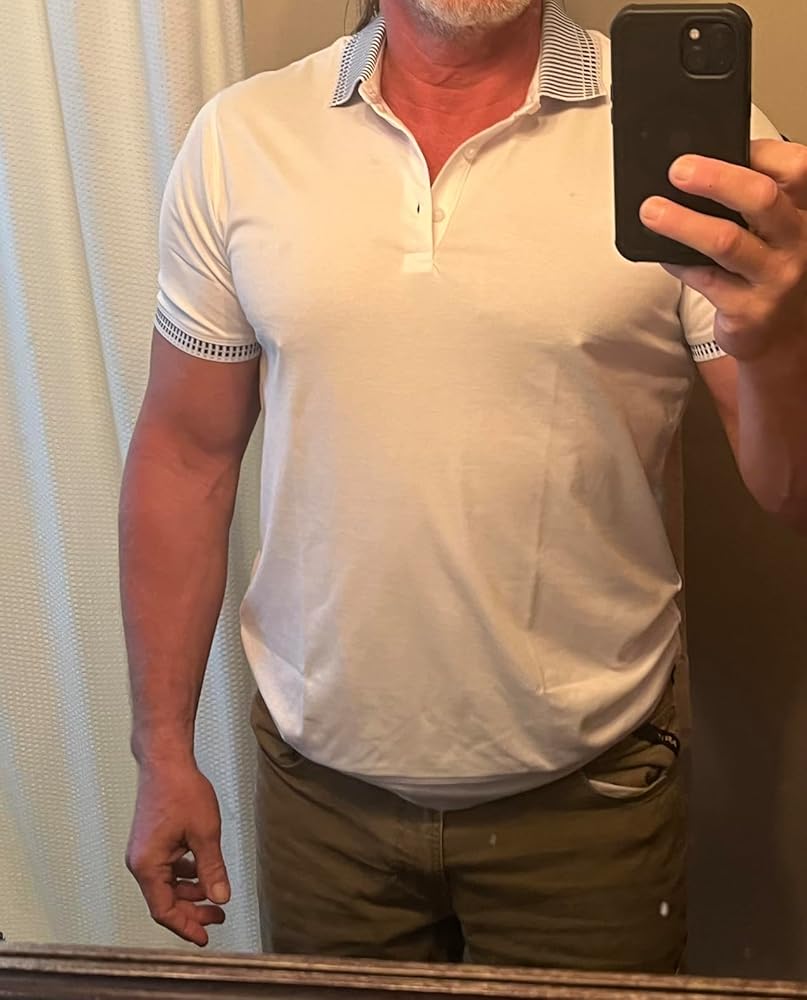 It’s a nice shirt. The fabric is stretchy and allows plenty of movement even though it is a slim fit and fit snuggly, but not too tight. The blue colors on the collar and into the sleeves provide a nice contrast to the white. It’s double stitched on the shoulder and seems to be well made. The bands at the end of the arms are a little tight, but I do work out a lot in my arms are a little bit bigger than average. Overall, it’s a nice shirt and I’ll be wearing it on vacation. I’m 195 pounds 511 and I ordered an extra large which just fits.